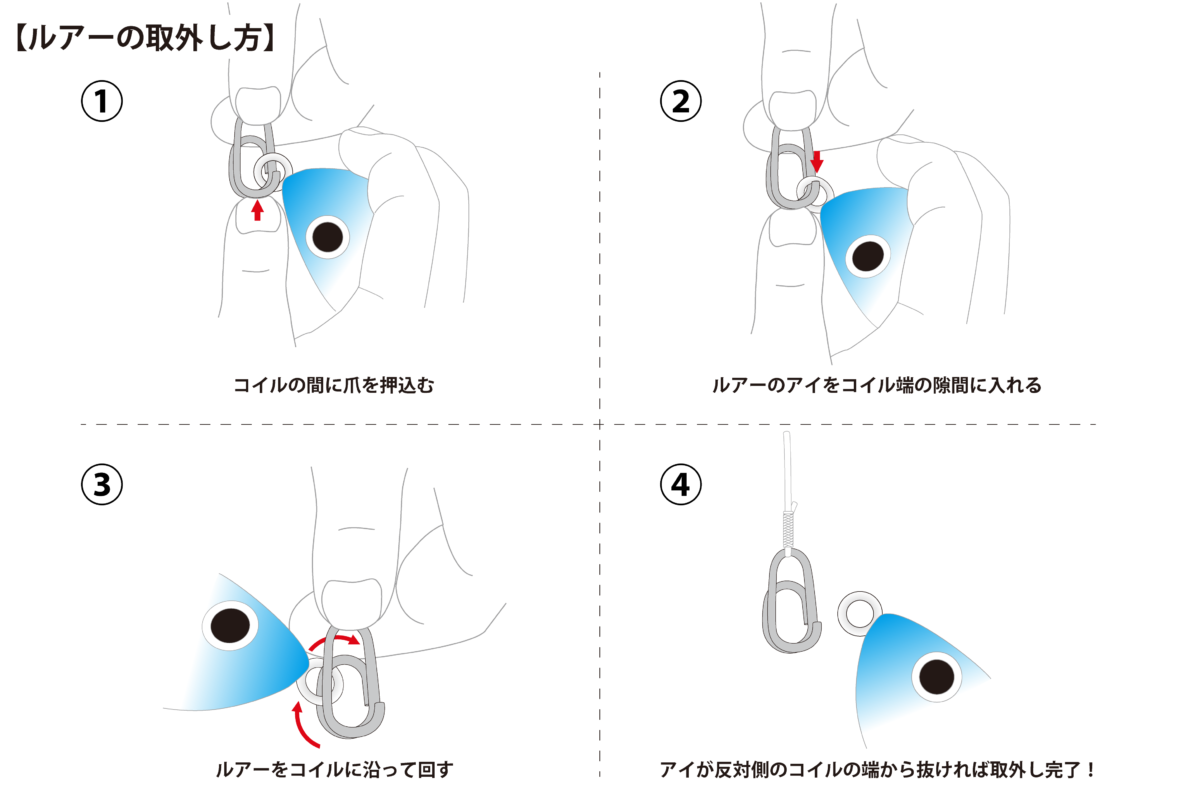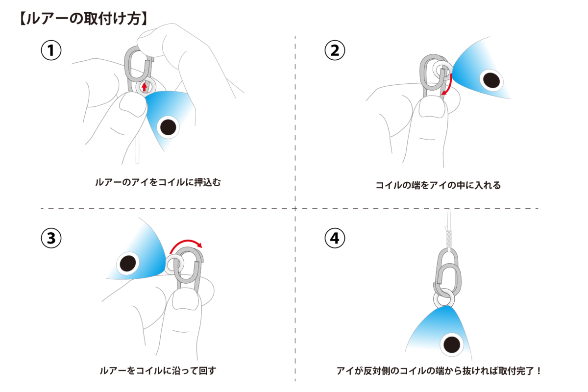 Effectively a split ring with one loop of the coil pulled out to connect to, making for a simple, tool-less, quick-change interface without any closures that may accidentally unlatch. High strength for heavy drag settings and very reliable.